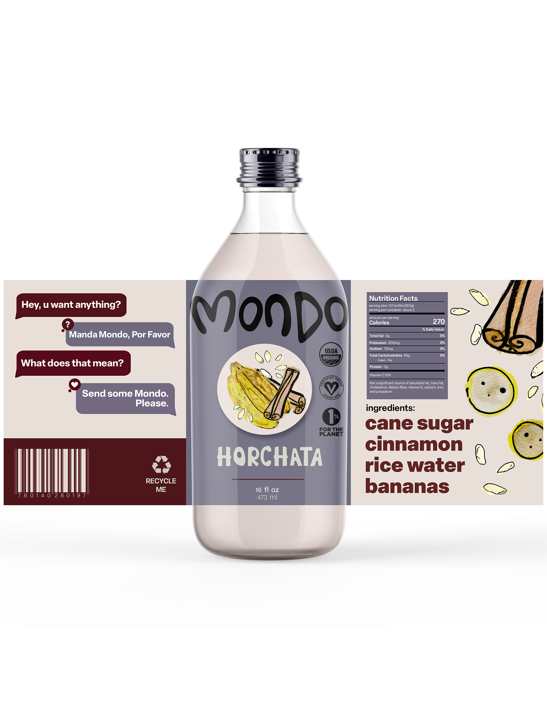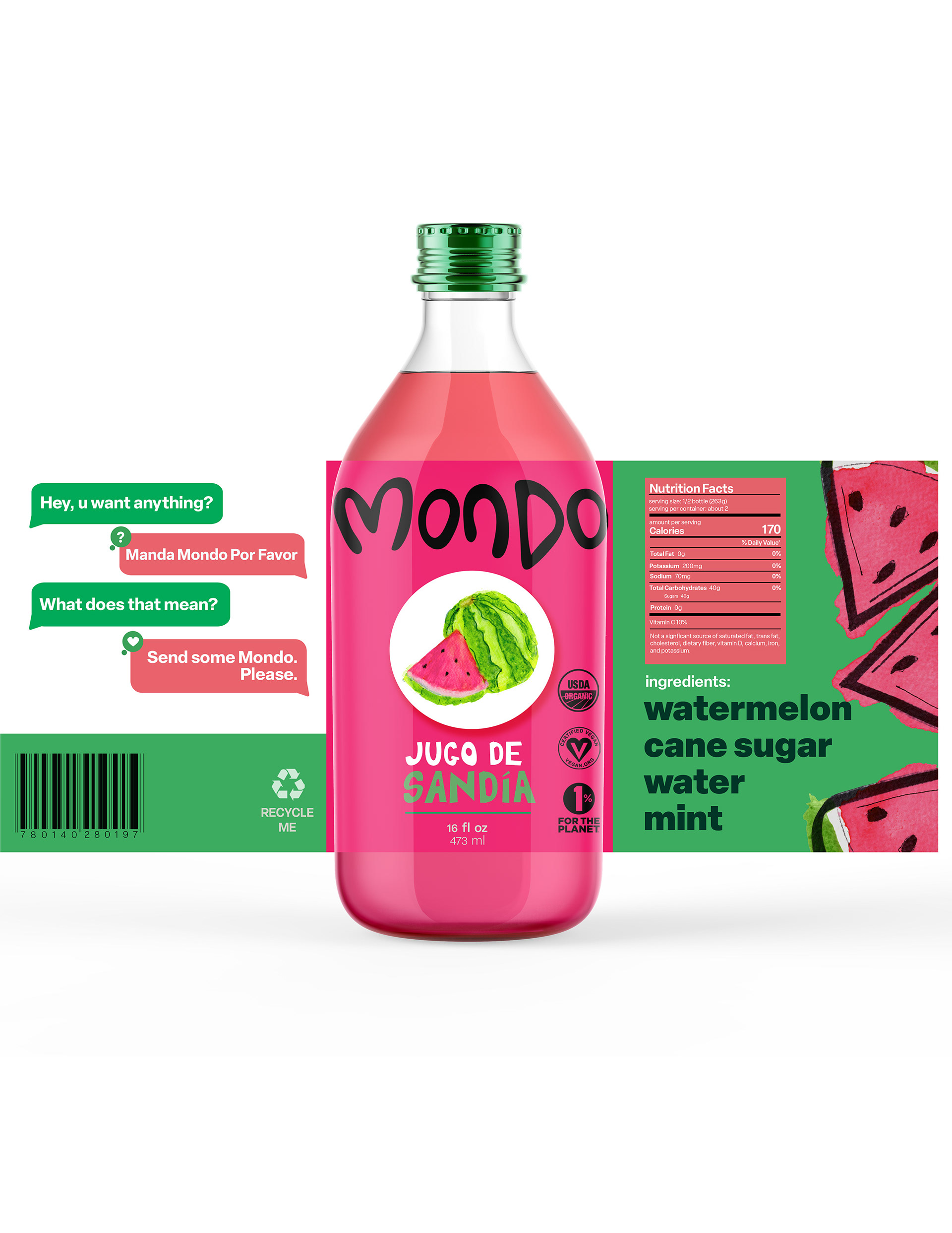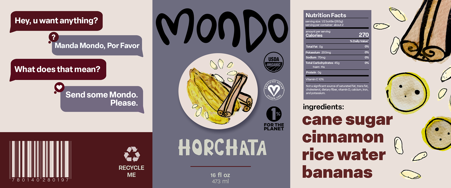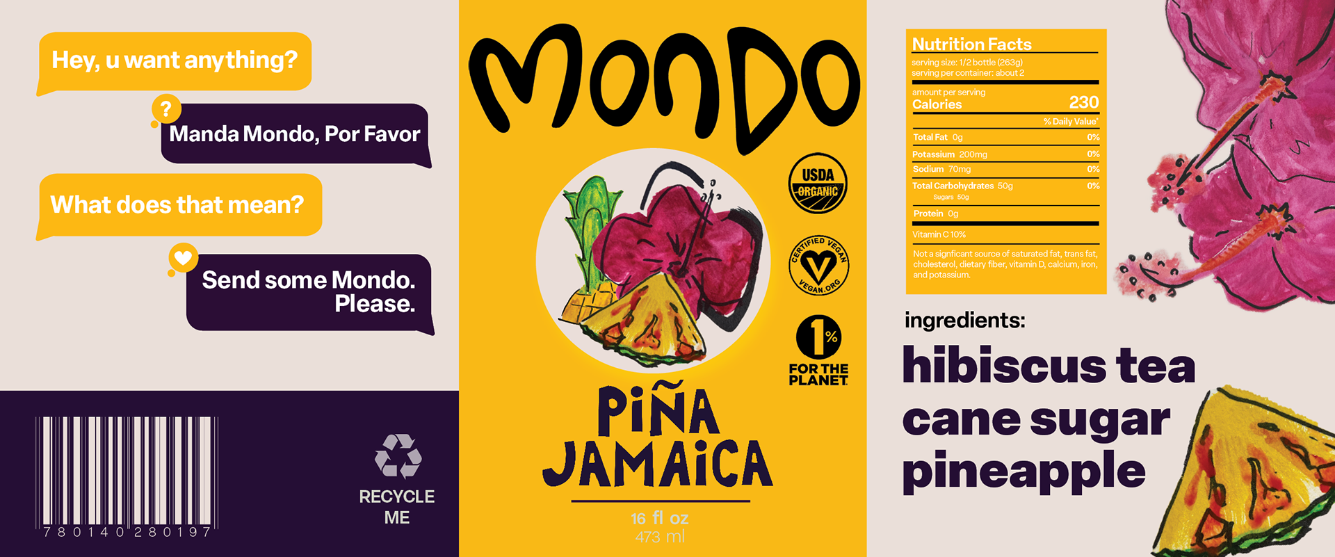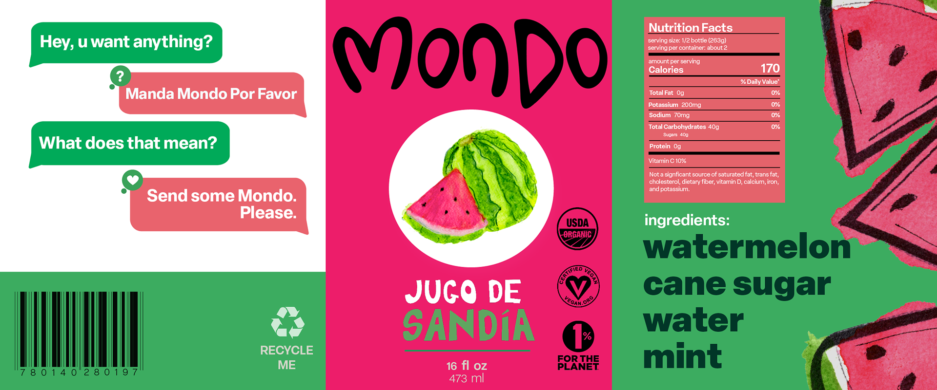 Mondo is a beverage influenced by traditional Latin American 'frescos', a delicious, fruity, beverage. Mondo's target audience geared towards the Latinx community, and those who enjoy Latin American, authentic flavors.