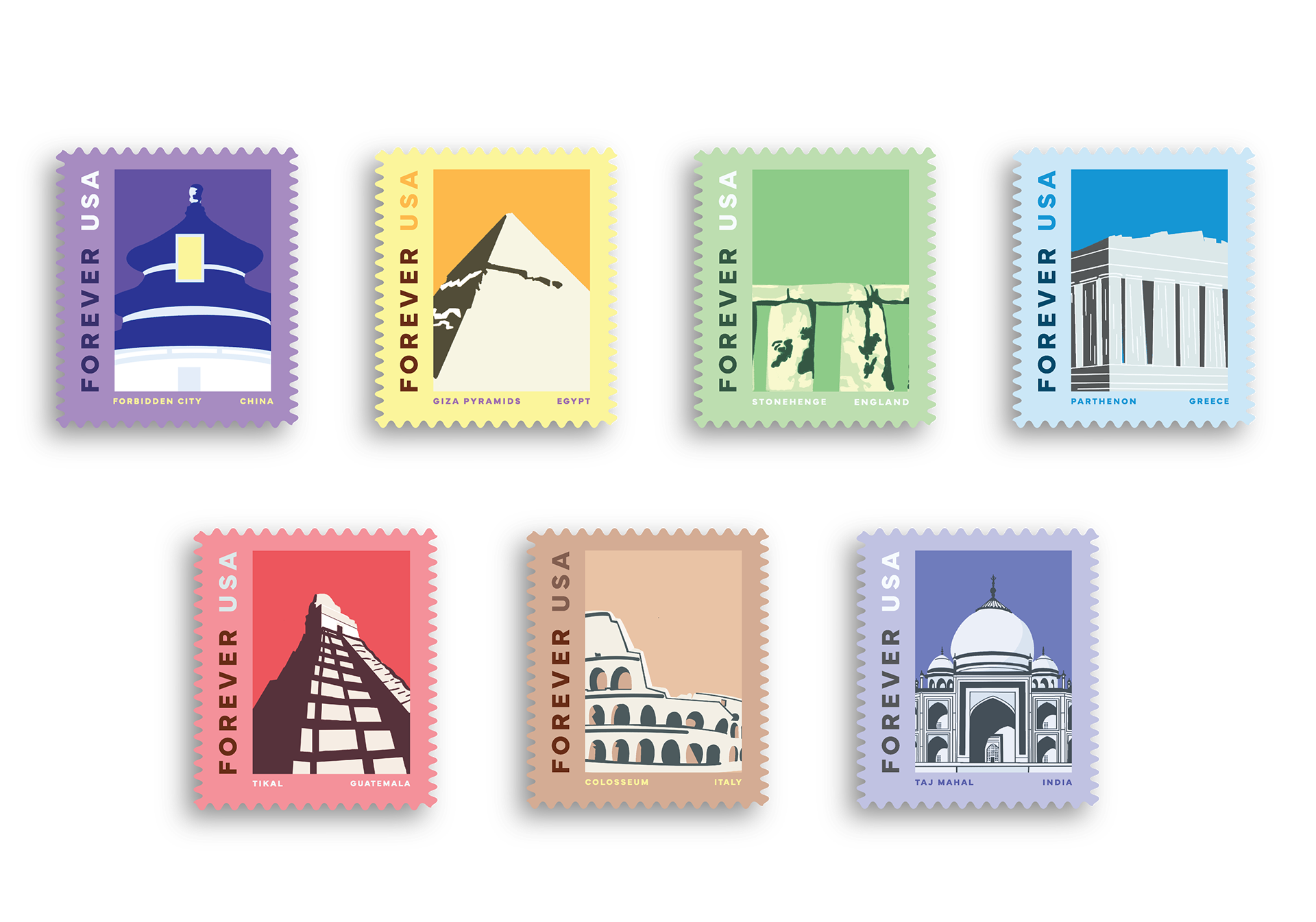 7 forever stamps, a pick of today's historical wonders of the world.
